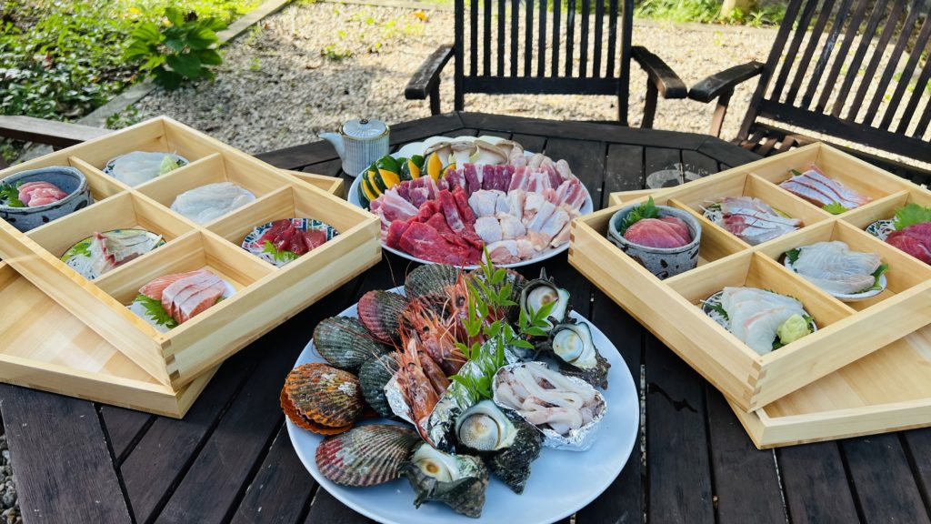 お部屋の前で気軽にできるのが最高!メニューには地元の海の幸がふんだんに使われていて、家族4人(1人は赤ちゃん)でもボリューム満点で大満足でした。