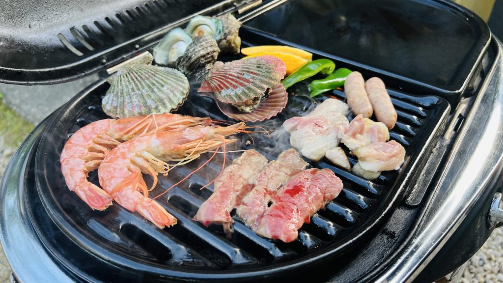 今回のお楽しみは、宿泊コテージの前でのバーベキュー。